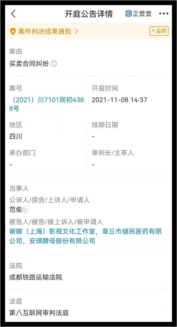 微博今天(18日)突然疯传一张开庭公告,只见谢娜的工作室、某医药公司和某酵母公司同时被列为被告,案件是“买卖合同纠纷”,曾在8日下午开庭。