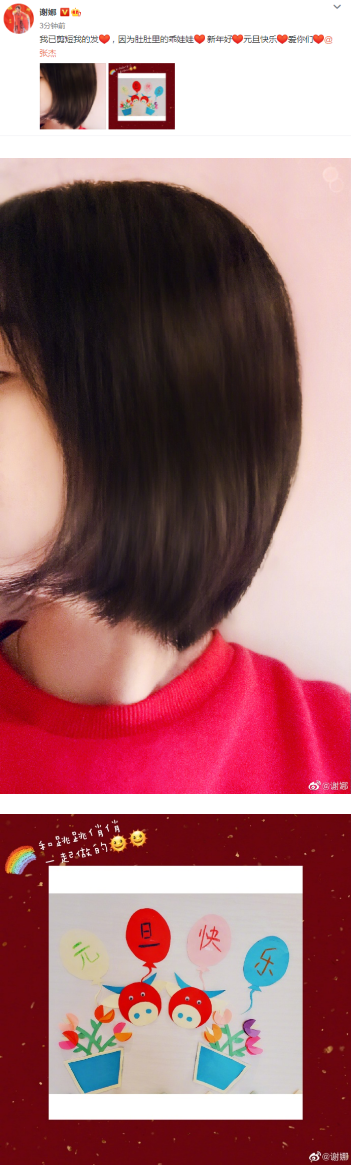 谢娜今天(1日)在微博发文,晒出自己短头发的侧脸自拍,甜蜜官宣:“我已剪短我的发,因为肚肚里的乖娃娃。”
