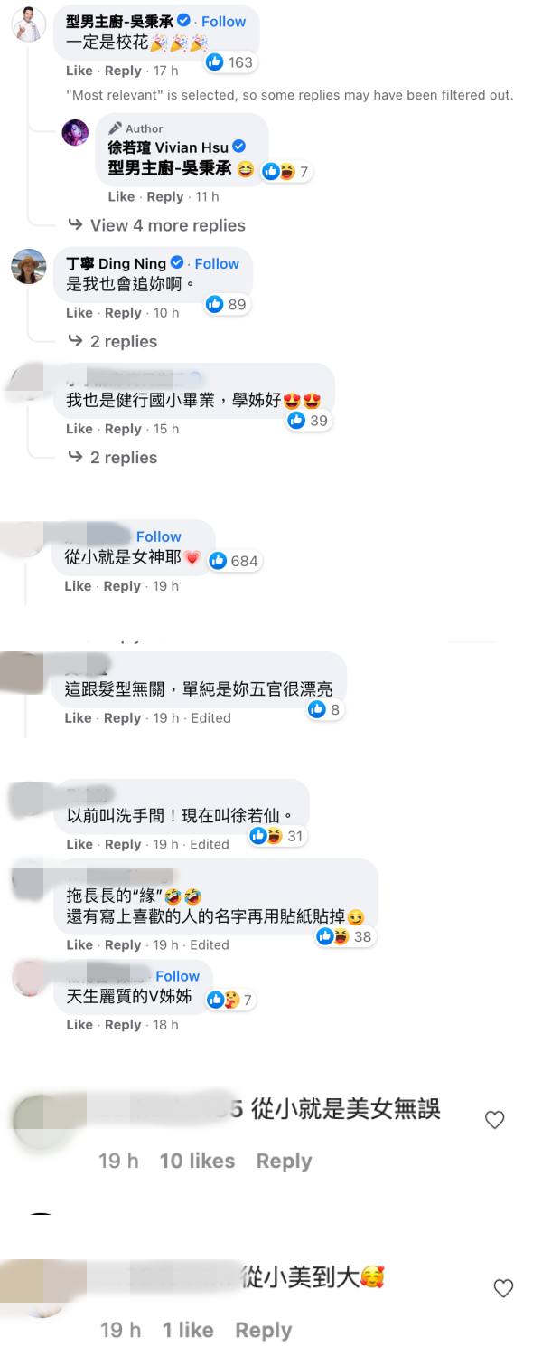 虽然在翻出照片后她自己都觉得傻眼,直呼:“以前怎么会有人暗恋我”,但网友们看到照片后纷纷留言夸奖:“从小就是美女”、“一定是校花”、“以前叫洗手间,现在叫徐若仙”、“从小就是女神”、“这跟发型无关,单纯是你五官很漂亮” 等。
