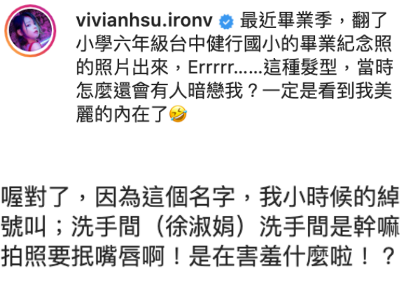6月是台湾的毕业季,因新冠肺炎升温的原因,许多毕业生们无法到学校参与毕业典礼,只能在网路上晒出毕业照过一过毕业瘾。46岁的女星徐若瑄近日也搭上了这一波毕业季,不只晒出了自己小学6年级的毕业照,更是发文透露了自己小时候的一些趣事。