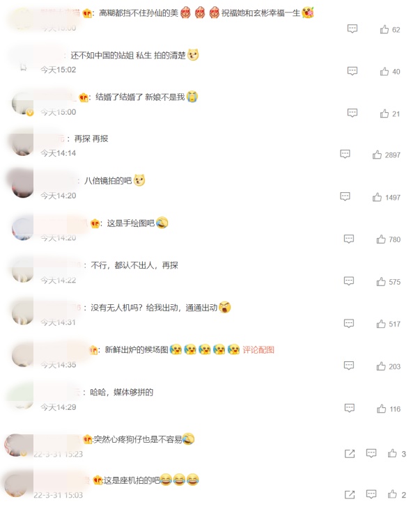 网上先流传出玄彬和孙艺珍为婚礼彩排的画面,紧接着再传出数张婚礼现场摆放着的婚纱照,但由于照片画质模糊,网友们看了都笑说,“哈哈,媒体够拼的”、“八倍镜拍的吧”、“不行,都认不出人,再探”、“高糊都挡不住孙仙的美”等。