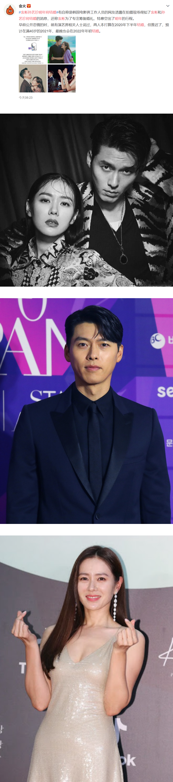 1日早,微博出现了“玄彬孙艺珍明年将结婚”的热搜词引起网友关注,贴文中提到韩国电影圈内的工作人员透露,在拍摄现场得知玄彬和孙艺珍将结婚的消息。同时爆料者还说到,玄彬为了筹备婚礼,特地空出了明年的行程。