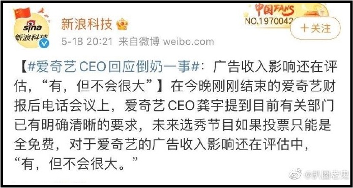 爱奇艺CEO龚宇昨天(18日)在会议上谈到“倒奶事件”,透露北京广播电视局已发了新的明确的通告,“选秀类节目不能再通过买产品买会员的方式给选手投票。所以,未来的选秀节目如果投票的话只能是全免费。”