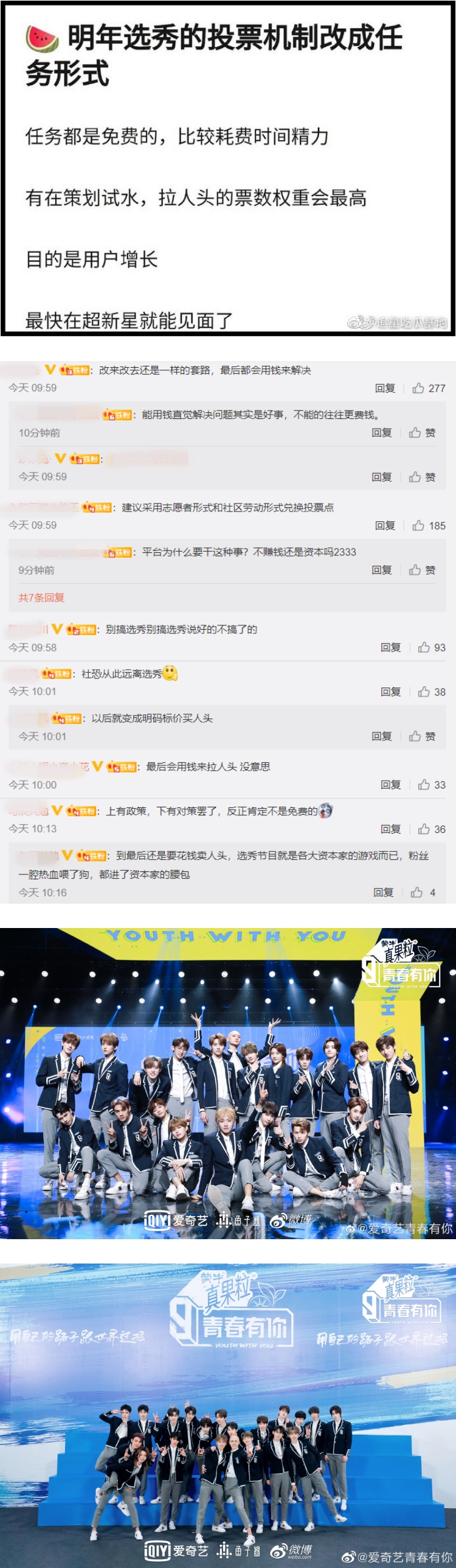 其后有网友爆料,指新的选秀投票机制将更改成任务形式,任务虽然是免费的,但会比较耗费时间与精力。
