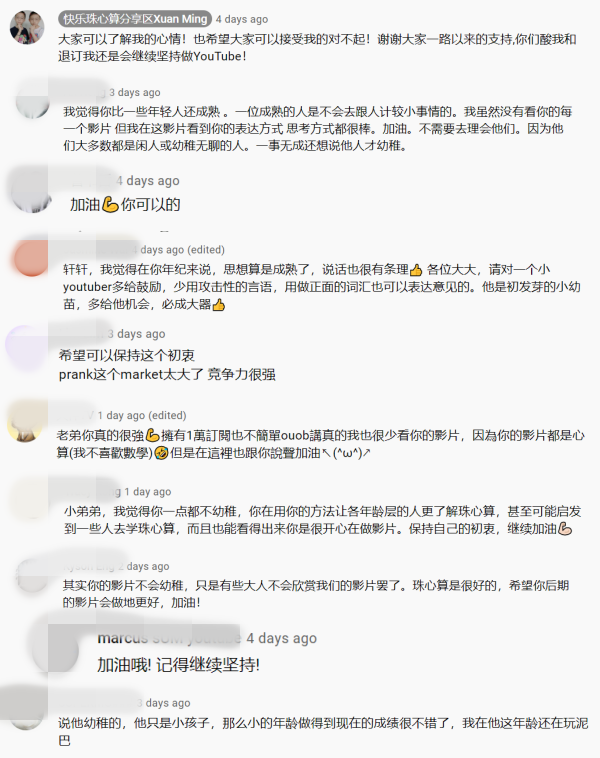 网友看了Xuan Xuan的影片后赞说,他的思路清晰,清楚自己做什么一点都不幼稚,“我觉得你比一些年轻人还成熟”、“其实你的影片不会幼稚,只是有些大人不会欣赏我们的影片罢了”、“保持自己的初衷,继续加油”、“我觉得在你年纪来说,思想算是成熟了”等。
