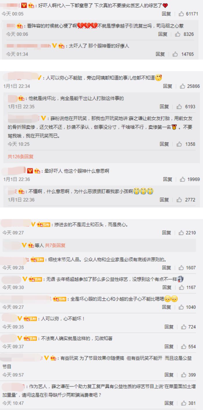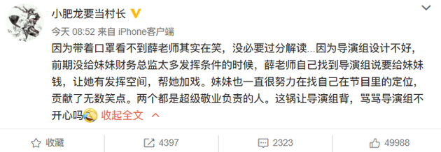 其后,疑似是该节目组的导演发声表示:“因为带着口罩看不到薛老师其实在笑,没必要过分解读”,并大赞杨超越、薛之谦都是敬业、负责的人,“这锅让导演组背,骂骂导演组不开心吗?”