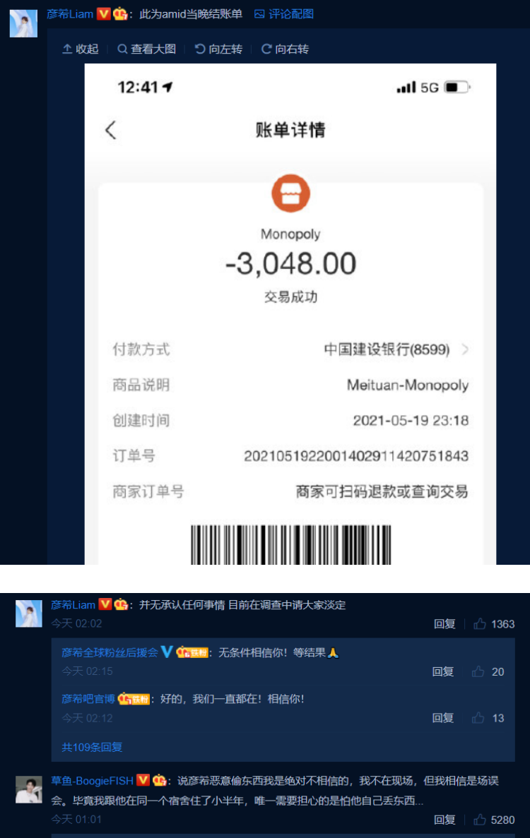 彦希随后也在自己的微博评论区晒出当晚的账单,“并无承认任何事情,目前在调查中,请大家淡定。”