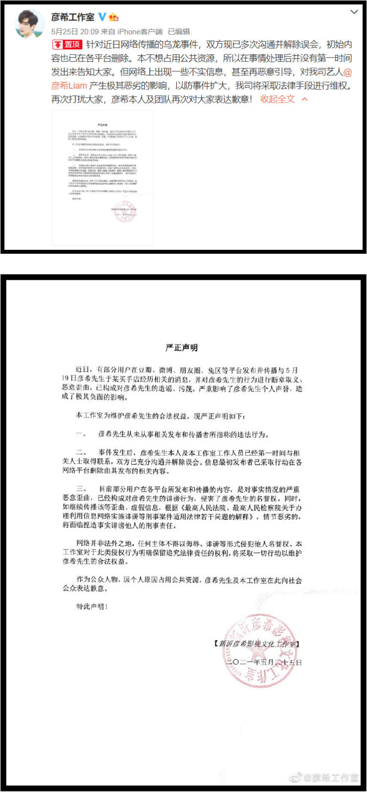 彦希工作室随后也发声明,强调彦希从未从事违法行为,“针对近日网络传播的乌龙事件,双方现已多次沟通并解除误会,初始内容也已在各平台删除。本不想占用公共资源,所以在事情处理后并没有第一时间发出来告知大家。但网络上出现一些不实信息,甚至再恶意引导,对我司艺人彦希产生极其恶劣的影响,以防事件扩大,我司将采取法律手段进行维权。再次打扰大家,彦希本人及团队再次对大家表达歉意!”