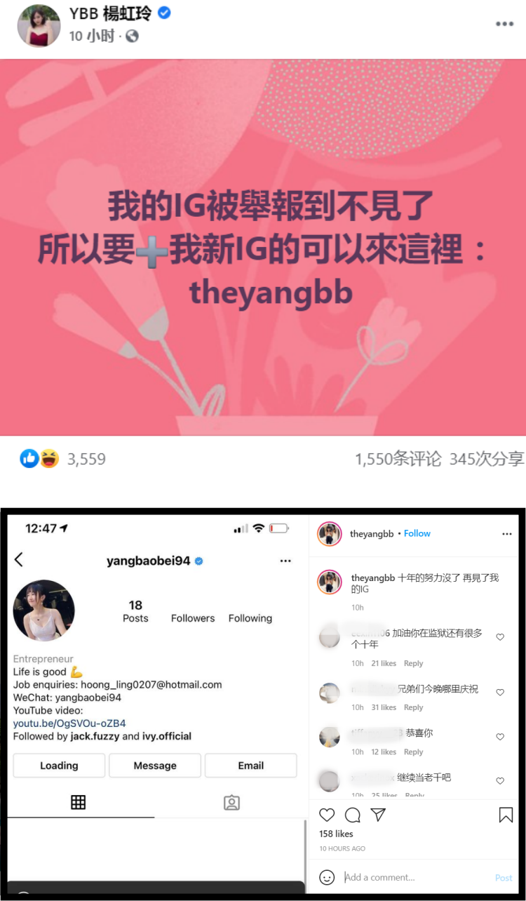 杨宝贝的官方IG账号因被许多网友举报而遭到封锁,她今天(24日)凌晨在FB发文,宣布自己开了新的IG小号,并在新的账号发文,无奈写道:“十年的努力没了 再见了我的IG”。