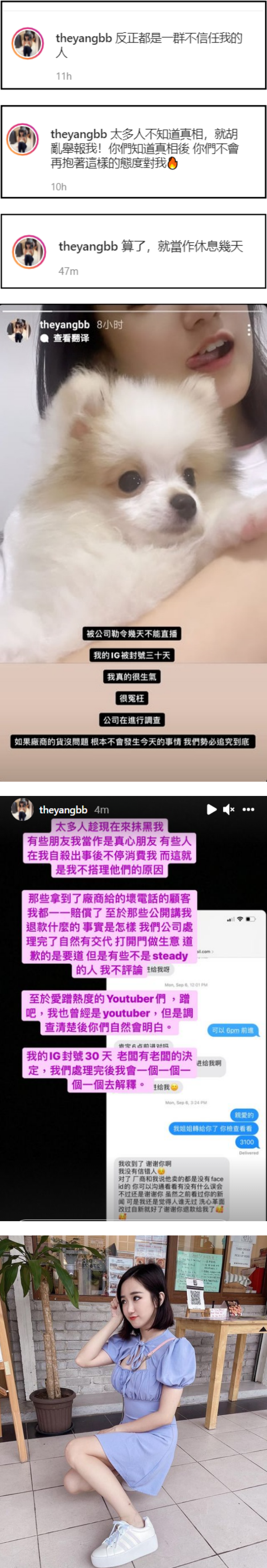 杨宝贝随后也在story发文,指自己的IG账号被封锁30天,“我真的很生气,很冤枉”并透露公司正在进行调查,“如果厂家的货没问题,根本不会发生今天的事,我们势必追究到底”。
