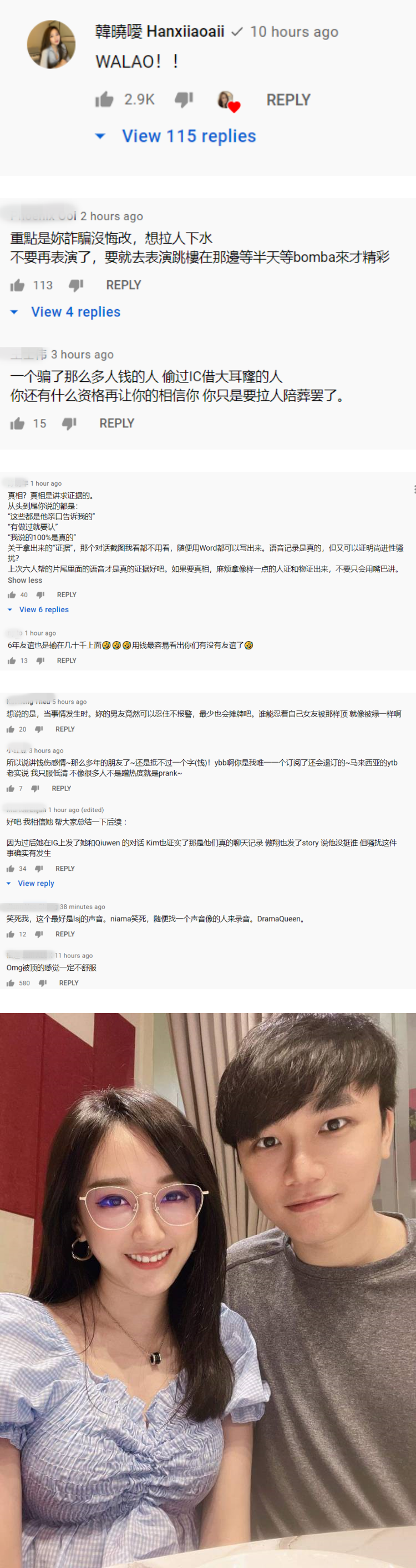 杨宝贝影片上传后立刻掀起热议,就连韩晓嗳都激动留言吃瓜。不少网友都留言批评:“你还有什么资格再让你的相信你,你只是要拉人陪葬罢了。”、“如果要真相,麻烦拿像样一点的人证和物证出来,不要只会用嘴巴讲”、“我们要听Lsj的语音,不是Dr Lau的。大家都在等着。”