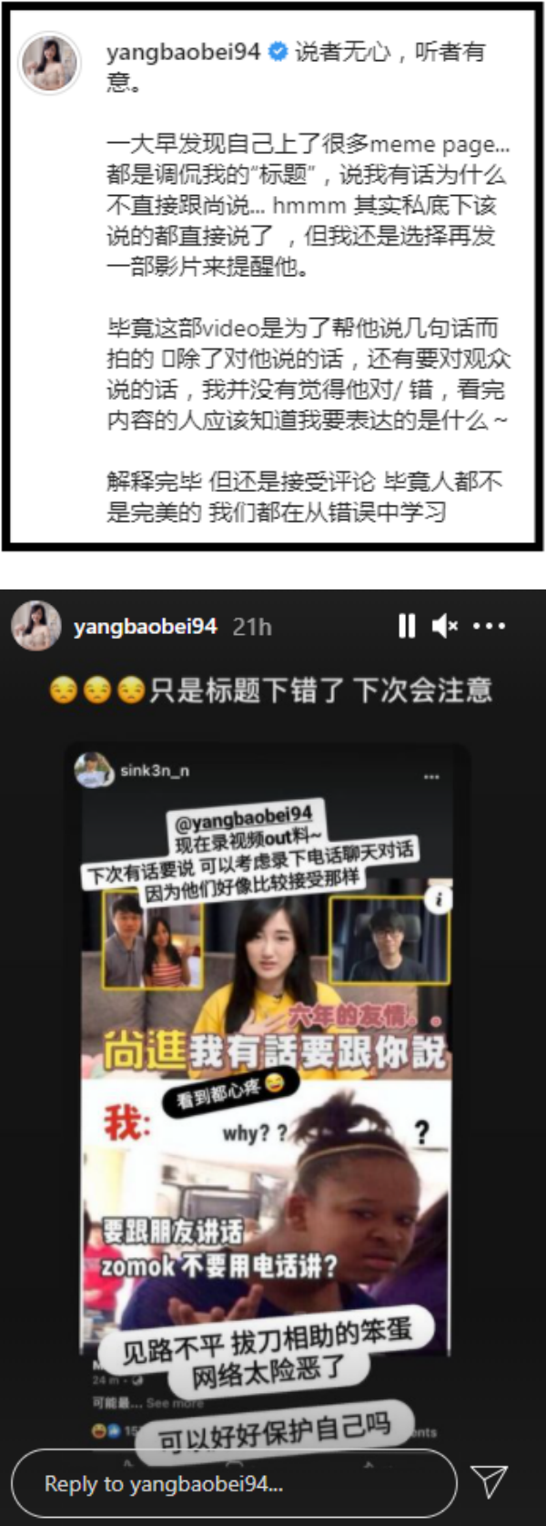 她其后再度在IG story表示:“只是标题下错了,下次会注意”。