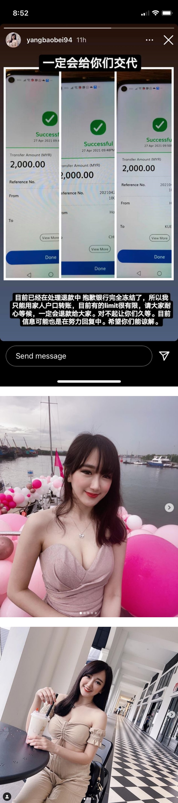 杨宝贝日前透露因银行被举报到冻结,无法第一时间处理退款事宜。她昨晚在IG story晒出3张各2千令吉的退款截图,表示已借用家人的银行户口来处理退款。