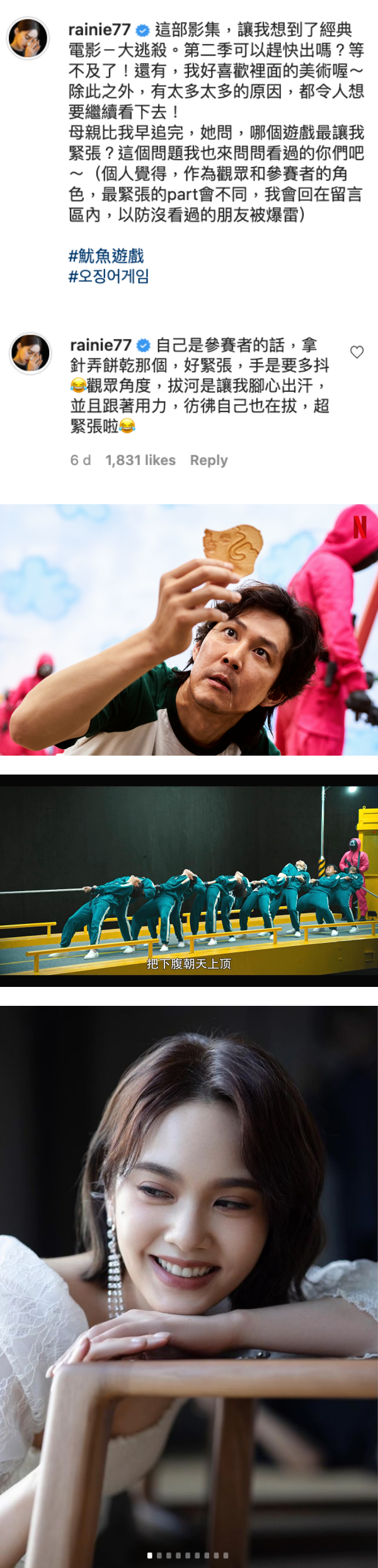 她一发文后立刻引来网友们的留言:“是有点像”、“我要跟yumi 一组”、“我要把弹珠全部给Yumi”、“随性大小便也像001号”、“真的超像欸”、“回不去了啦”、“是否过于入迷在《鱿鱼游戏》” 等。