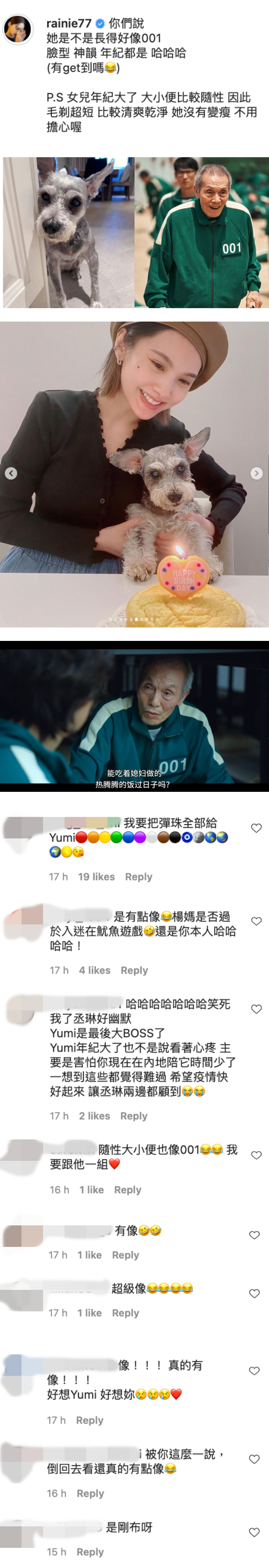 杨丞琳17日于Instagram上传了一张爱犬Yumi的近照,只见狗狗修长脸型、深邃眼窝再加上2条白眉,让她越看越眼熟,这才发现“你们说,她是不是长得好像001(吴一男),脸型、神韵、年纪都是哈哈哈”。