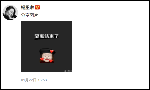 杨丞琳在22日下午,PO出一张写着“隔离期结束了”,并附上爱心表情的黑色背景图。除此之外,她没有在帖文中透露更多讯息。