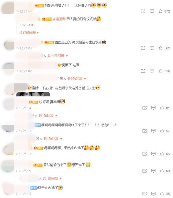 杨丞琳和李荣浩同框照曝光后,网友直呼,“姐姐来内地了!!!太惊喜了呀”、“见面了 哇塞”、“终于来内地了”、“果然偷偷的来了 想死你了”等。