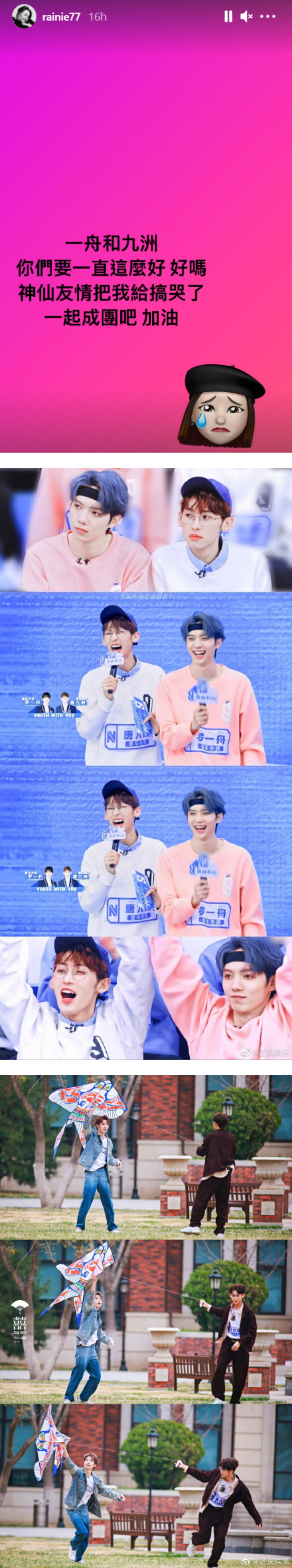 杨丞琳昨天在IG story发文,激动喊话罗一舟、唐九洲:“你们要一直这么好,好吗?神仙友情把我给搞哭了,一起成团吧,加油!”并附上一个女孩哭泣的表情。