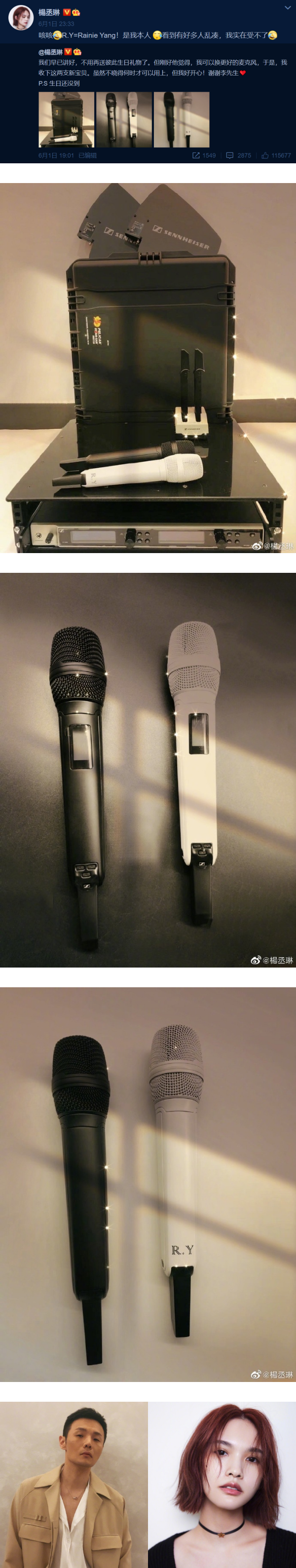 1日晚,杨丞琳在微博上发放了一对黑白麦克风的照片,她在贴文中提到,之前和李荣浩说好了,今后不再送对方生日礼物,但李荣浩觉得杨丞琳是时候换更好的麦克风,“于是,我收下这两支新宝贝。虽然不晓得何时才可以用上,但我好开心!谢谢李先生❤️”。