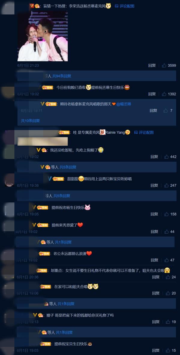 随后,杨丞琳再留言称麦克风上印着的“R.Y”其实也就是自己的英文名Rainie Yang;面对杨丞琳突如其来的放闪和狗粮,网友纷纷留言,“今日份狗粮已查收”、“期待用上这两只新宝贝听妳唱”、“我还没吃饭呢,先吃上狗粮了”、“老公永远都那么浪漫”等。