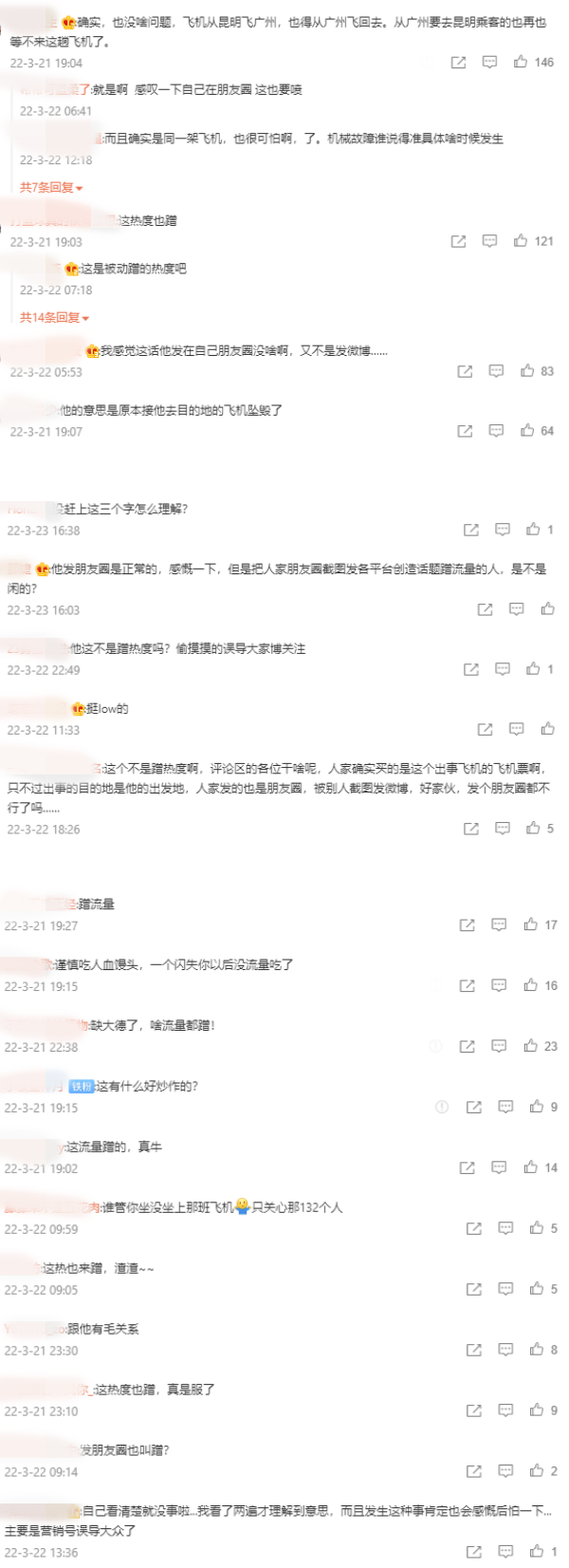 消息传开后,网友痛批:“这热度也蹭”、“谨慎吃人血馒头,一个闪失你以后没流量吃了”、“这有什么好炒作的?”、“没赶上 真的特别误导让人摸不到头脑”,但也有人觉得这是他在朋友圈的发言,只是在自己的空间抒发心情:“感叹一下自己在朋友圈 这也要喷”、“他的意思是原本接他去目的地的飞机坠毁了”、“他发朋友圈是正常的,感慨一下,但是把人家朋友圈截图发各平台创造话题蹭流量的人,是不是闲的?”