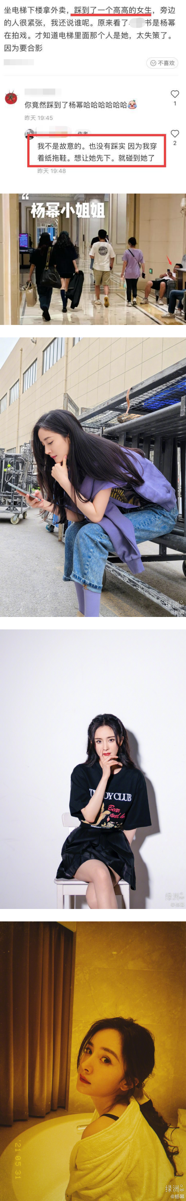 该贴文流传后,有网友笑说,“你竟然踩到了杨幂 哈哈哈”、“杨幂一直都是谦逊有礼貌的人”、“生活中的杨幂,还真是没有一点明星的架子”等。