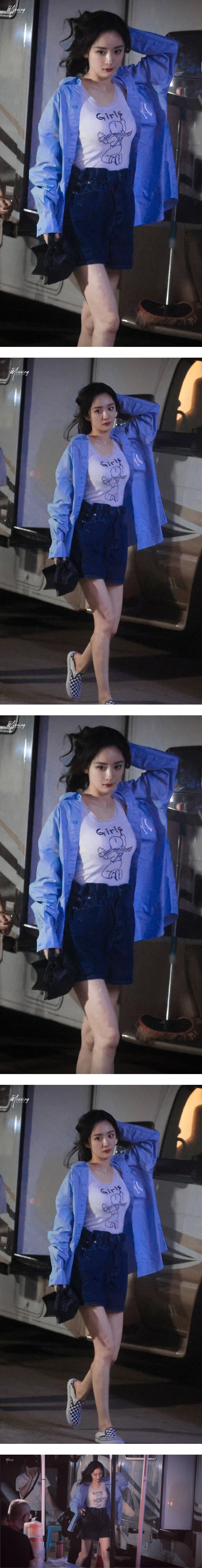 杨幂的站姐昨晚(21日)在微博晒出一组杨幂的下班路透照,照片中,只见她穿着白色背心搭配蓝色衬衫,下半身则穿着牛仔短裙,大方秀出一双笔直纤细的长腿。她边走边整理秀发,举手投足间风情万种。