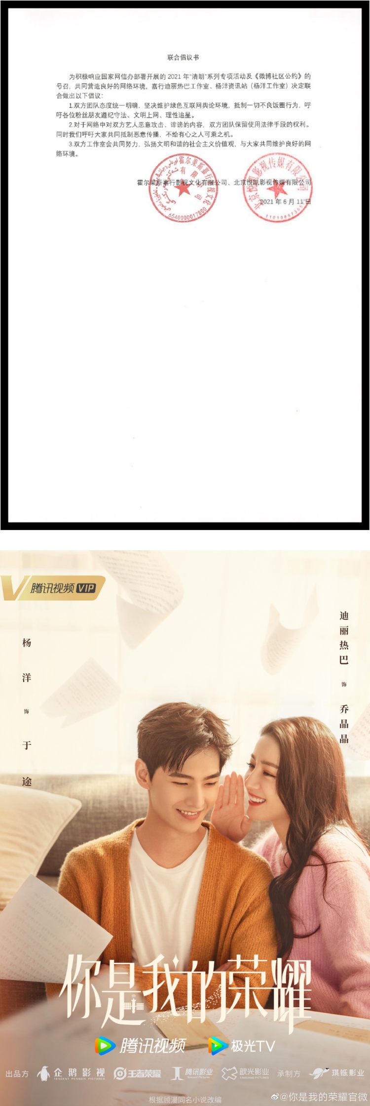 杨洋、迪丽热巴自从官宣合作后,粉丝之间就发生许多摩擦,双方工作室昨天(11日)下午发布联合倡议,呼吁粉丝理智追星:“坚决维护绿色互联网舆论环境,抵制一切不良饭圈行为,呼吁各位粉丝朋友遵纪守法、文明上网、理性追星”、“对于网络中对双方艺人恶意攻击、诽谤的内容,双方团队保留使用法律手段的权利。同时我们呼吁大家共同抵制恶意传播,不给有心之人可乘之机。”