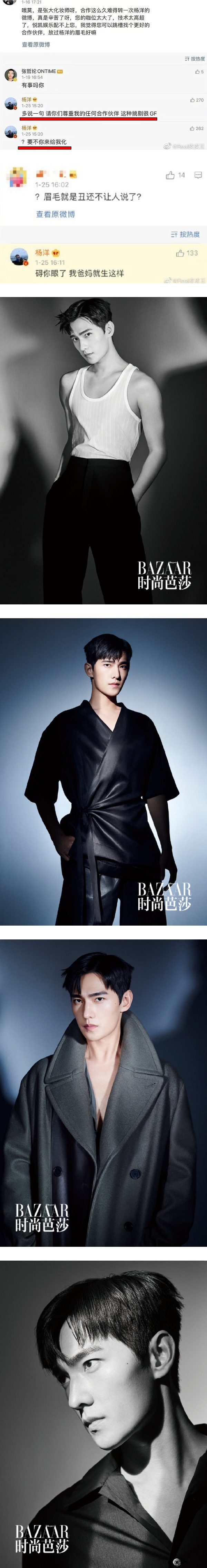 杨洋化妆师在微博上转发了一组,杨洋拍时尚杂志照,没想到却被网友攻击,“化得很难看”、“眉毛化成这个样子,我要是你真没脸转发”等。