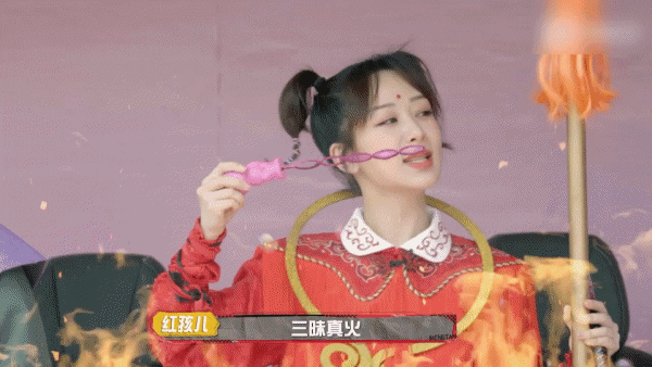 这也是杨紫自Cosplay 《还珠格格》系列中的紫薇格格后再度挑战了《西游记》里红孩儿的造型,化身为百变达人。杨紫在节目中除了梳着招牌红孩儿的发型出场,最好笑的是她竟然吹着泡泡当作“三昧真火” 出场,直接萌翻所有的观众。