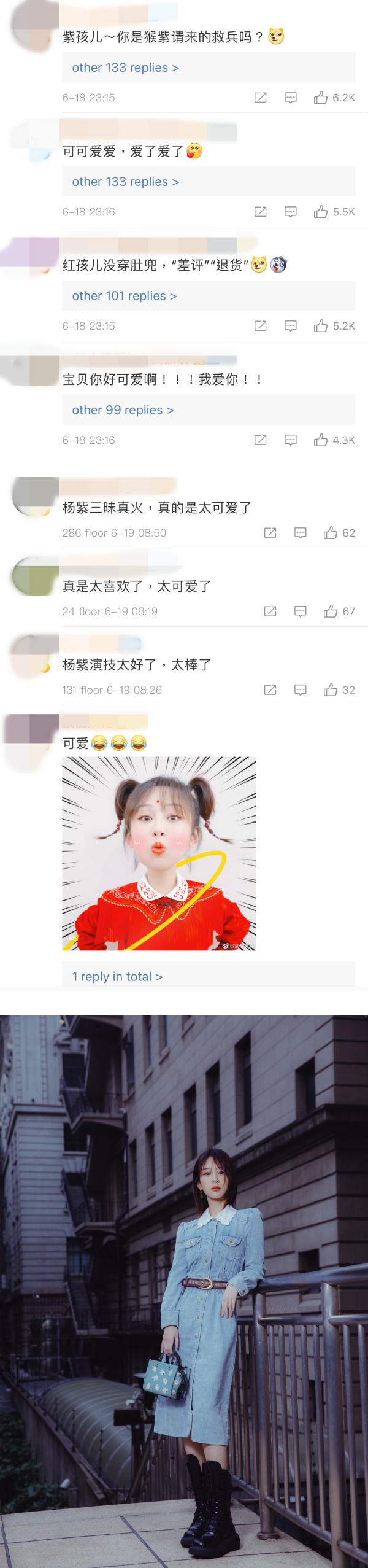 网友们在看到杨紫超萌的造型后纷纷留言:“紫孩儿,你是猴紫请来的救兵吗?”、“可可爱爱,爱了爱了”、“杨紫好漂亮啊”、“怎么会有那么可爱的红孩儿” 等。