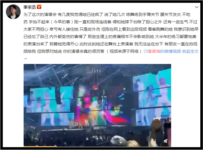 在杨丞琳踩空意外曝光后,老公李荣浩也发微博,透露杨丞琳这次为了演唱会而付出许多努力,“有几度我觉得她已经疯了,几次练舞练到手臂关节、腰关节发炎,不吃药手抬不起来”,因此让一直都与现场连线的他在得知老婆摔下舞台后,心疼表示:“除了担心之外还有一些生气,不过大家不用担心,幸亏有人接住她,只是皮外伤。”