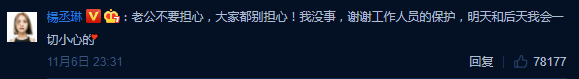 而杨丞琳也在演唱会结束后,立刻上线报平安:“老公不要担心,大家都别担心!我没事,谢谢工作人员的保护,明天和后天我会一切小心的”,并附上一个爱心符号。