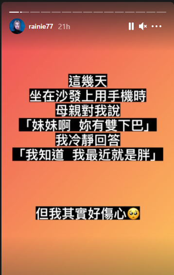 杨丞琳昨天(11日)在IG story发文自曝,被妈妈说的5个字伤到了,透露:“我其实好伤心。”
