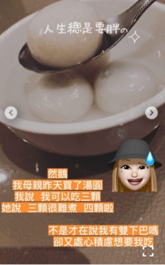 不过,她之后又晒出妈妈煮的汤圆,哭笑不得表示:“我说我可以吃3颗,她说3颗很难煮,4颗啦!不是才在说我有双下巴吗?却又处心积虑想要我吃!”