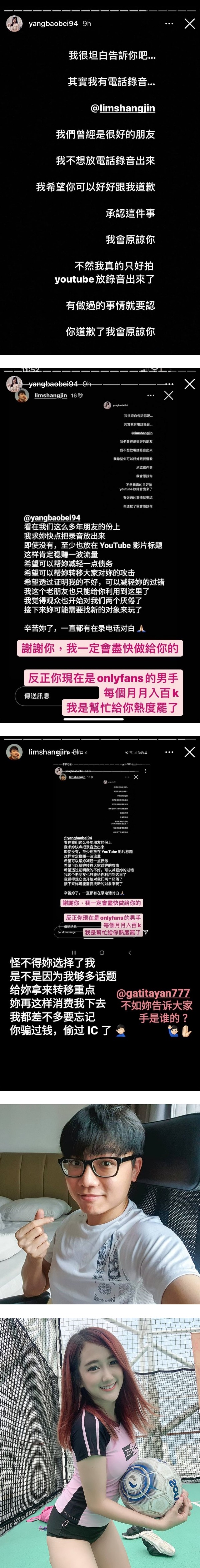 本地网红杨宝贝(YBB)和多年好友林尚进在近日开撕,两人在Instagram Story上隔空喊话,YBB说手握林尚进的电话录音,同时要求对方向自己道歉否则将曝光该录音,林尚进则回应,希望对方真的能放出来,这样就可以稳赚流量。