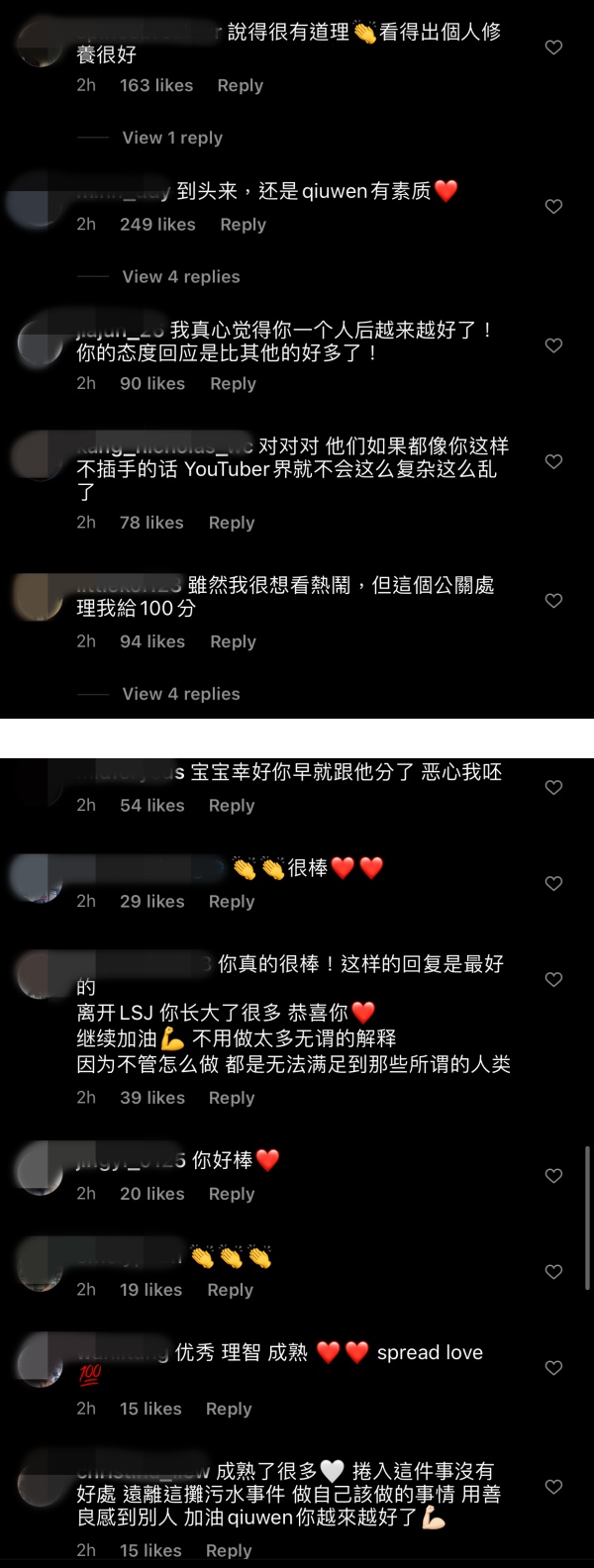 粉丝们纷纷盛赞秋雯的帖文非常正能量,更留言:“说的很有道理,看得出个人修养很好“、”到头来,还是qiuwen最有素质“、”如果都像你一样不插手的话,YouTube 界不会那么复杂“、”虽然想看热闹,但公关处理给100分“。