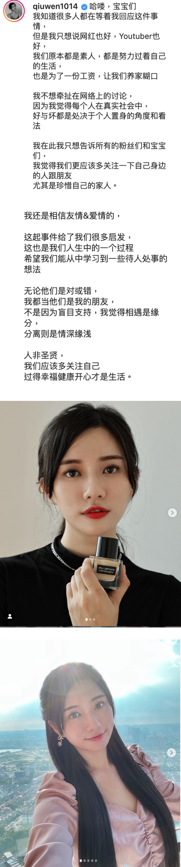 秋雯在帖文中提到许多粉丝都在等着她回应YBB 和林尚进的事情,但她声明自己不想牵扯网路上的讨论,因为在真实社会中好与坏都是取决于个人置身的角度和看法。