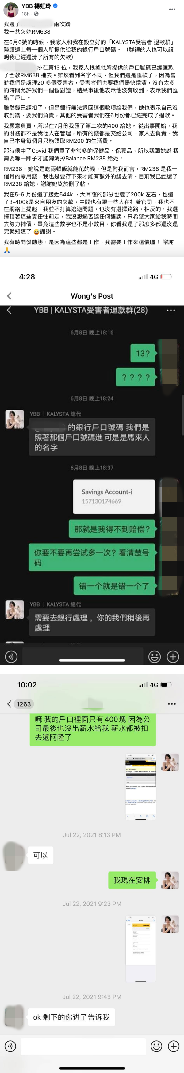 YBB也在帖文中提到,自己在5-6 月份还了接近544k ,加上高利贷及朋友的欠款及官司费,半年以来已经还了超过百万令吉。她声明:“我并不打算逃避问题,也没有选择跑路,相反的,我选择顶著这些责任往前走,我没想过否认任何错误,只希望大家给我时间去努力补偿,毕竟这些数字也不是小数目。”