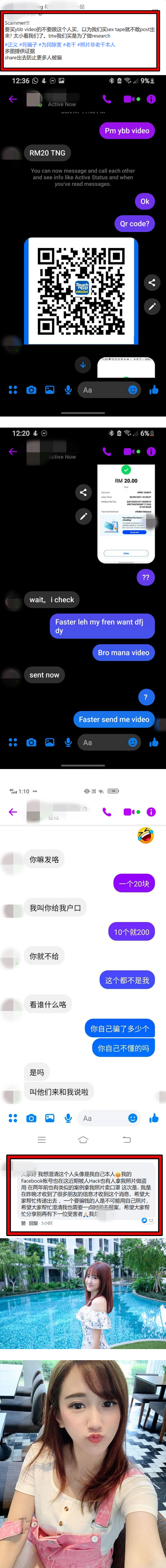 网友A在FB上发文写下,“Scammer!要买ybb video的不要跟这个人买,以为我们买sex tape就不敢post出来? 太小看我们了”;网友A贴出数张和卖家的对话截图,图中看到对方以RM20售卖疑似是YBB的性爱短片,卖家还要求透过TouchnGO转账RM20,以获得该影片。
