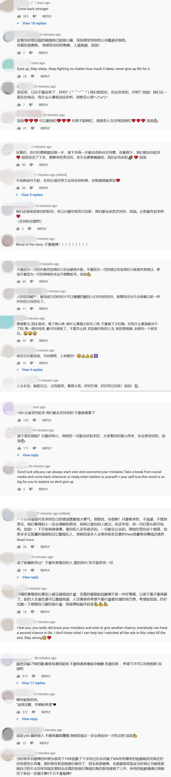 视频曝光后网友纷纷留言,要YBB重新振作、远离赌博: