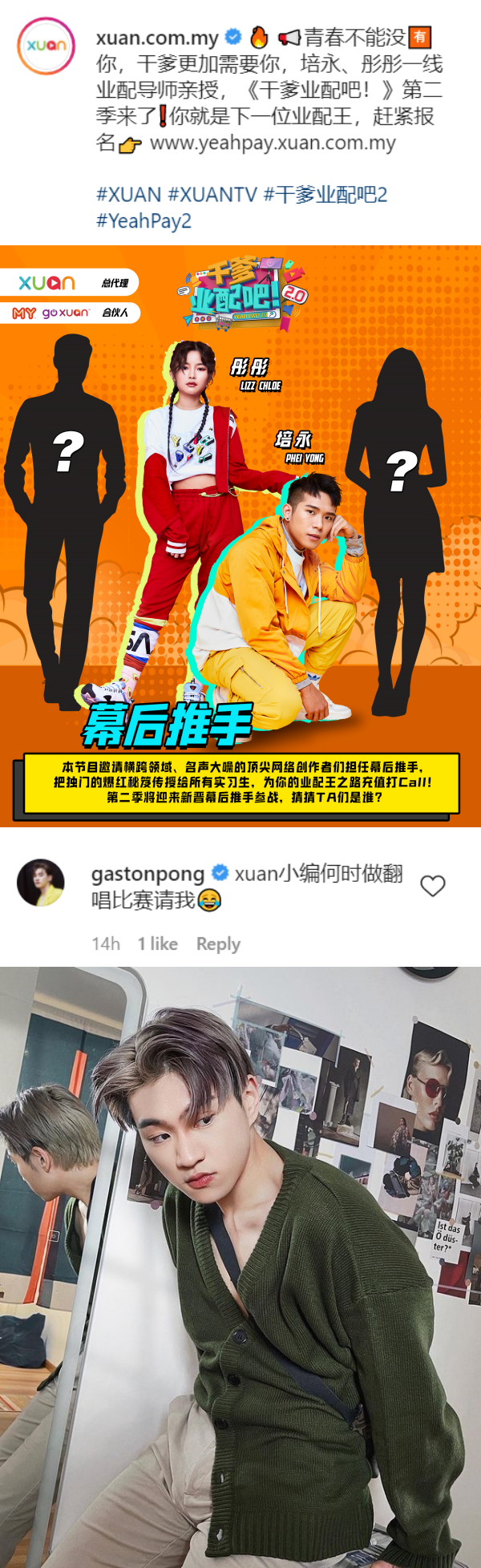 《干爹业配吧!》第二季官宣后,立即引起网友的关注,其中歌手Gaston(庞加斯顿)在XUAN Instagram上留言写下,“xuan小编何时做翻唱比赛请我”,哎哟上一季的《干爹业配吧!》主题曲《干爹业配OK?》不就是由Gaston一手包办词曲创作了吗?