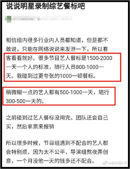还有另一种算法则是如果在酒店内用餐,艺人每日餐费3000元,其他人员1000元;如果无法在酒店内用餐,需要外出用餐的话,则是艺人每天1500元,其他工作人员200元。