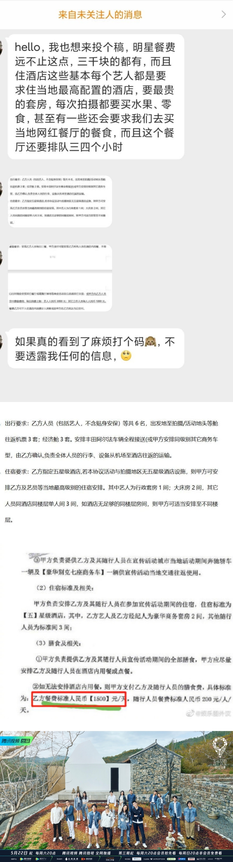随后陆续有网友爆料,公开艺人合约里的餐费细节,包括明星一天的餐费标准是1500至2000元(约968令吉至1291令吉),而随行人员的餐费标准则是800元至1000一天。另外,另外化妆和梳妆费则是每次3万元,服装费一万元!