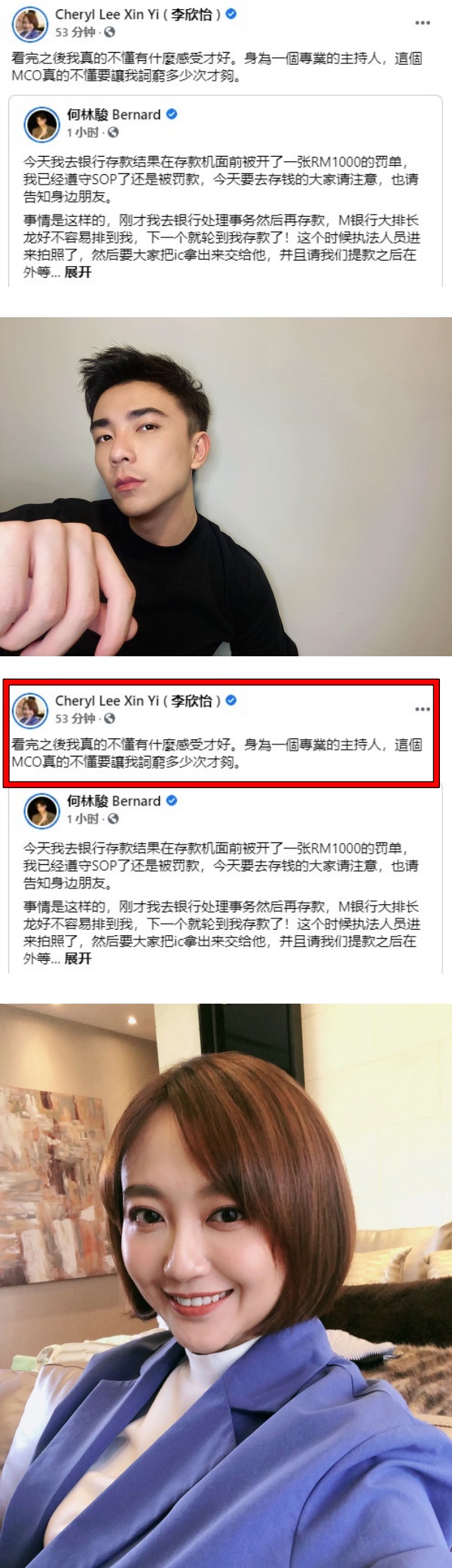 文末,何林骏说要是网友也遇上这类情况,记得要站出来,告诉其他人,“不然你也会像我一样莫名其妙的被罚款”;本地主持李欣怡也转发了何林骏帖文直呼,看完之后真的不懂该有什么感受,“身为一个专业的主持人,这个MCO真的不懂要让我词穷多少次才够。”