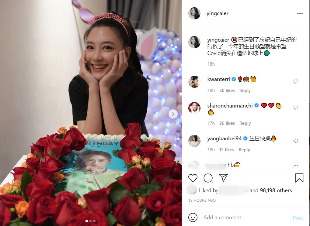 应采儿昨天在IG发文,写道:“已经到了忘记自己年纪的时候了....今年的生日愿望就是希望Covid消失在这个地球上。”