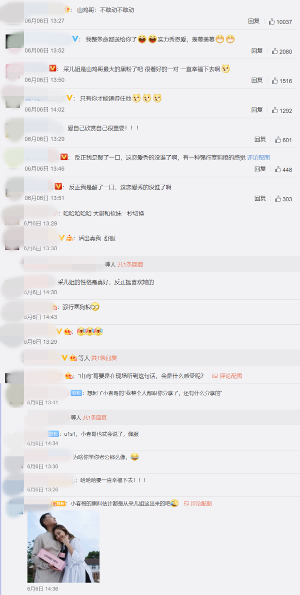 虽说应采儿嘴边在责备陈小春,但句子当中确藏有满满的爱,网友留言笑说,“实力秀恩爱,羡慕羡慕”、“ 只有你才能镇得住他”、“反正我是酸了一口,这恋爱秀的没谁了啊”、“小春哥的黑料估计都是从采儿姐这出来的吧”、“强行塞狗粮”等。