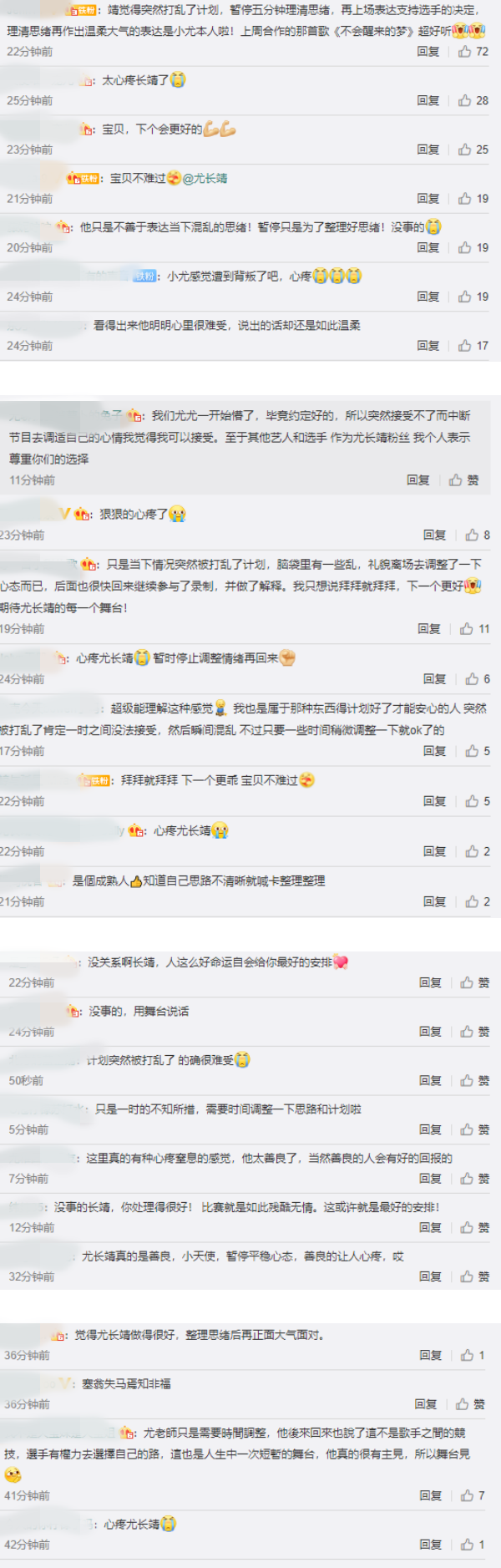 而尤长靖冷静下来、返场后,还反过来安慰选手遵从内心选择;网友心疼尤长靖:“看得出来他明明心里很难受,说出的话却还是如此温柔”、“下个会更好的”、“他只是不善于表达当下混乱的思绪!暂停只是为了整理好思绪”、“是個成熟人,知道自己思路不清晰就喊卡整理整理”、“面对突如其来的变化,暂离调整情绪,然后又迅速回来,还反过来安慰选手遵从内心”、“哎太心疼了 突然就这样遭到了背叛”。