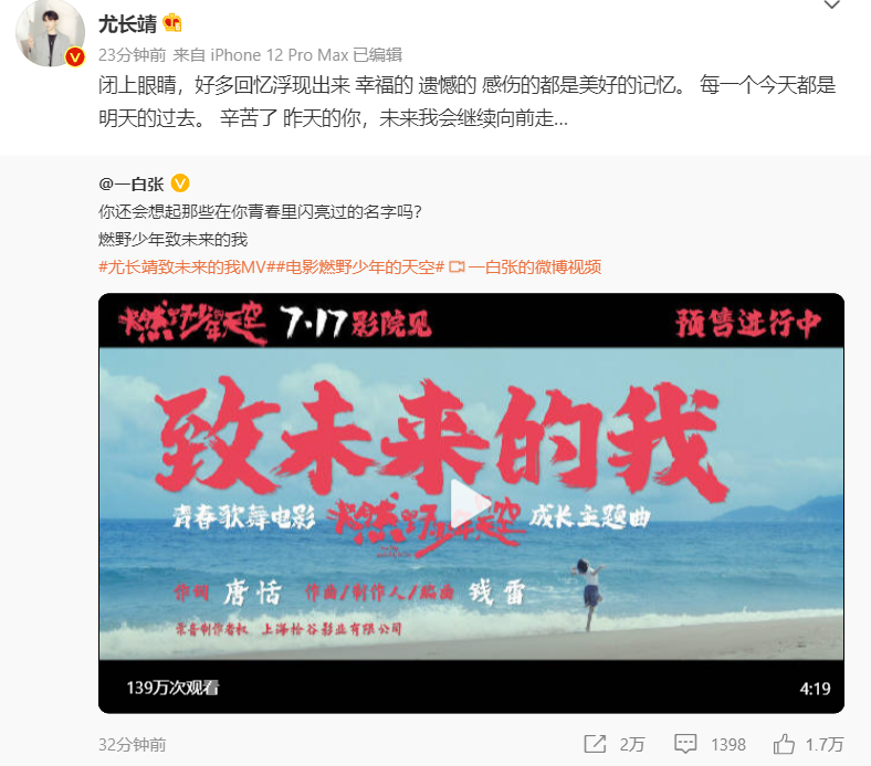 尤长靖随后也转发MV,写道:“闭上眼睛,好多回忆浮现出来 幸福的 遗憾的 感伤的都是美好的记忆。每一个今天都是明天的过去。辛苦了 昨天的你,未来我会继续向前走…”