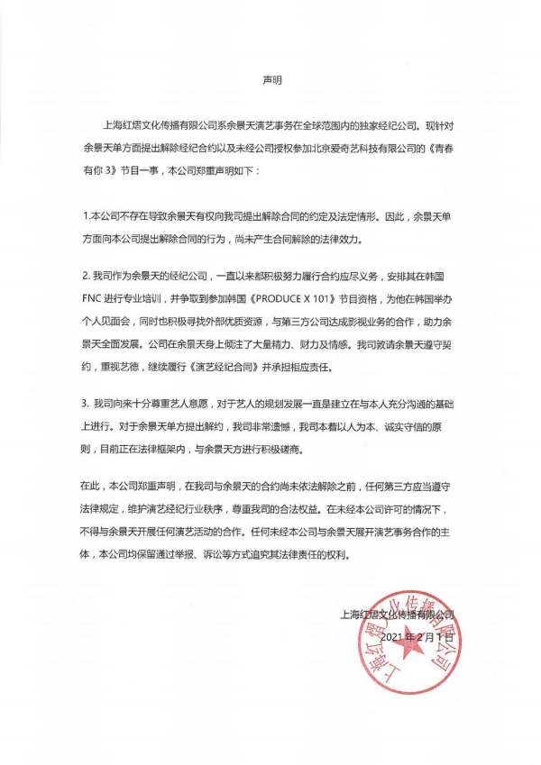 声明中表示,由于余景天单方面向公司提出解约,因此合同解除不具法律效力:“对于余景天单方面提出解约,我司非常遗憾;目前正在法律框架内,与余景天方进行积极磋商。”